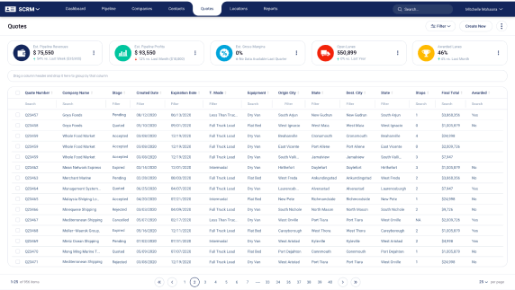 SCRM crunches the numbers for you, offering profitable pricing recommendations based on real-time market rates, historical lane rates, and margins for a particular customer—all in real-time as the quote is being created. Now, you can create quotes faster and win more deals with instant, data-driven pricing suggestions.